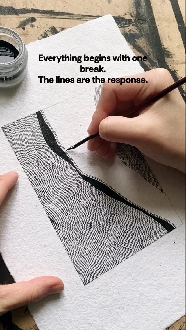 Her practice centers on the line — obsessive, repetitive, and diaristic. What began in Beijing with Chinese ink and a Soviet nib pen has developed into a long-term investigation of time, memory, war, and belonging. While drawing remains central, Olasyuk expands this language into canvas, rice paper, embroidery, woodcut, resin, photography, and limited-edition zines. She also creates guided meditations connected to her works, transforming exhibitions into spaces of reflection and stillness, where art becomes both visual and experiential.