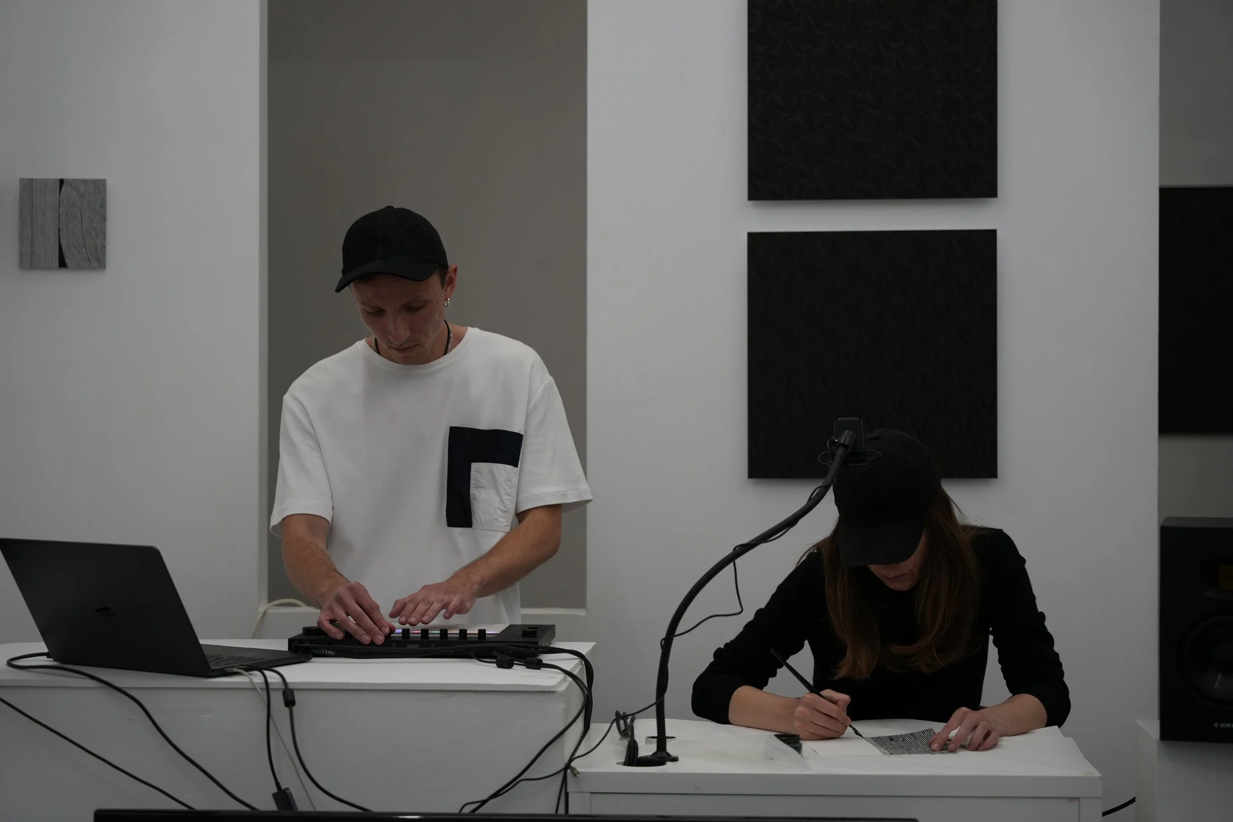 The Breath was a musical performance presented during Alena Olasyuk’s solo exhibition of the same name at Zero Gallery, Paris (24/05/2025). Developed in collaboration with Dmitry Esker, the work translated drawing into sound: each line became both a visual statement and a sonic event — two waveforms echoing each other in real time.